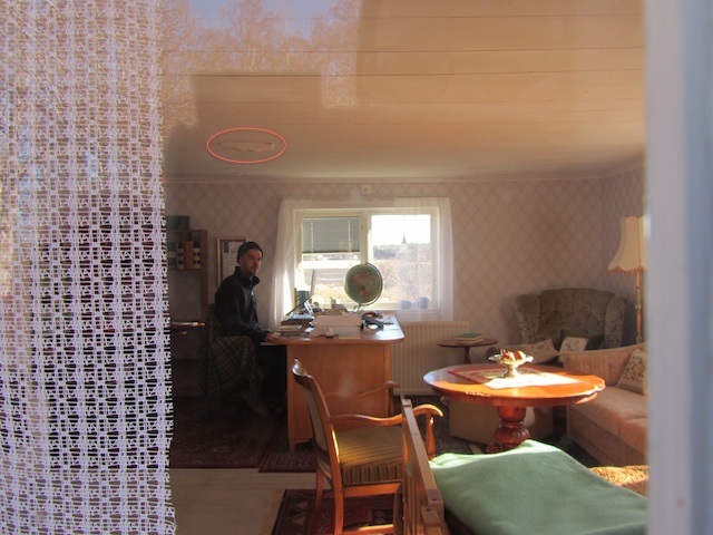 Se blomman! Det är årets första snödroppe. Där bakom skymtar vår kombinerade gäst- och skrivarstu-ga. I fjol somras bröt vi upp det gamla brädgolvet, la nya betong-fogar kring husgrunden, grävde upp och forslade bort jordmas-sor och ett oräkneligt antal upp-torkade körsbärskärnor som glup-ska råttor samlat in och sugit mär-gen ur. Vi skrapade, reglade och isolerade, satte upp gipsskivor och spacklade, tapetserade och svor och hade oss. Observera (nederst) den snidade klossen i taket. I den roterade vävstolens stående varp.