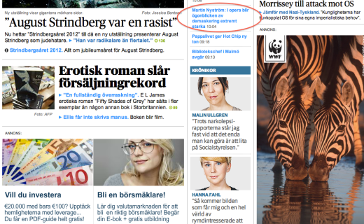 Däremot rungande rasistanklagelser post festum, fetstilsmarkerad hänförelse inför skyhöga försäljningssiffror, skum reklam för börsmäklarutbildning och chansar-tad belåning (inklusive gratis pdf-guide) som över dubbel halvspalt flankeras av två zebror vid ett vattenhål i milt rembrandtskt gryningsljus; Morrissey tillämpan-de Godwins lag, charmigt kåseri kring landningen på Mars, krönika om krönikörens orubbade tro på fortsatta statliga påbud om massvaccinering, nya ”pappainsikter” hos popgruppen Hot Chips – och så en ensligt belägen liten notis om ”avslöjande ögonblick” inom operahistorien, som i sin tur länkar till en intressant artikel om hur de snabba demaskeringslekarna i Monteverdi-operan Odysseus hemkomst ska ha möjliggjorts tack vare den mer ”flödande” musikstil som föregick högbarockens formbundna, treklangsbaserade tonalsystem.