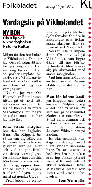 Sent omsider kom jag att uppmärksammas på ännu en Vikbodagbok-recension. Det är Sven Wernström som skrivit den – författaren till Trälarna samt ett åttiotal ytterligare böcker genom åren. Vikbolänning, även han, fast vi är ej bekanta och har alltså bara hejat på håll.