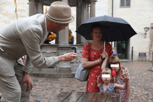 Men inte nog med detta. Två ytterligare bröllop hade vi äran att få gästa i somras. Ett i juni, ett i juli, ett i augusti. Den här ögonblicksbilden är extra lyckad, tycker jag, med dess askar-i-askar och sinnrika metanivåer. Och missa inte narrarna vid slottsbrunnen i bakgrunden..!