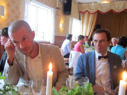 Sist men inte minst en bild från skärgårdsön Yxlan och bröllopsfesten där. Under hela vigselceremonin vräkte regnet ner över brudparet, som tycktes lika lyckliga ändå. Med ett knappt nödrop hann G och jag med sista vägfärjan från Furusund och fick springa i regnet ner mot fjärden där brudparet stod i blåsten på en klippa. Mona Sahlin förrättade vigseln men från min utsatta position såg jag egentligen bara läpparna röra sig och paraplyer, kavajsprund och skira klänningsfållar slitas och flaxa omkring i den byiga vinden. Nåväl. Här hade det nyss klarnat upp och vinden bedarrat och vi har just satt oss till bords. Jag ser en smula besvärad ut, förmodligen för att jag är varse att jag fotograferas från tvärsöver bordet samtidigt som jag försöker konversera mitt bordssällskap, närmare bestämt den ena brudens far: en underhållande och karismatisk man som jag aldrig träffat förut. Tur att jag hade fått Jesper vid min vänstra sida, som dock på denna bild en aning klentroget tycks mönstra sin lätt lomhörda bordskavaljer…